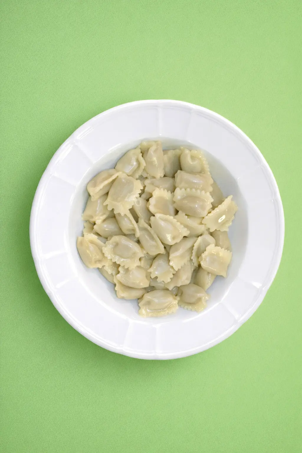 Ravioli del Plin ripieni di patate, funghi e cipolle serviti con margarina